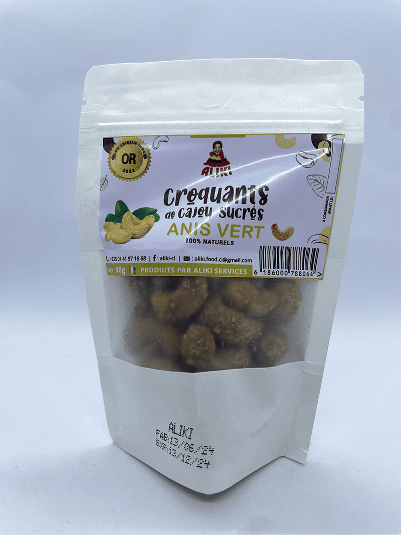 Croquants de cajou sucrés anis vert en sachet 50g – ALIKI