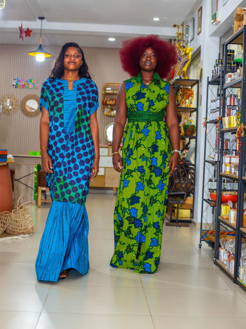 Robe longue pagne vert bleu et tissu bleu