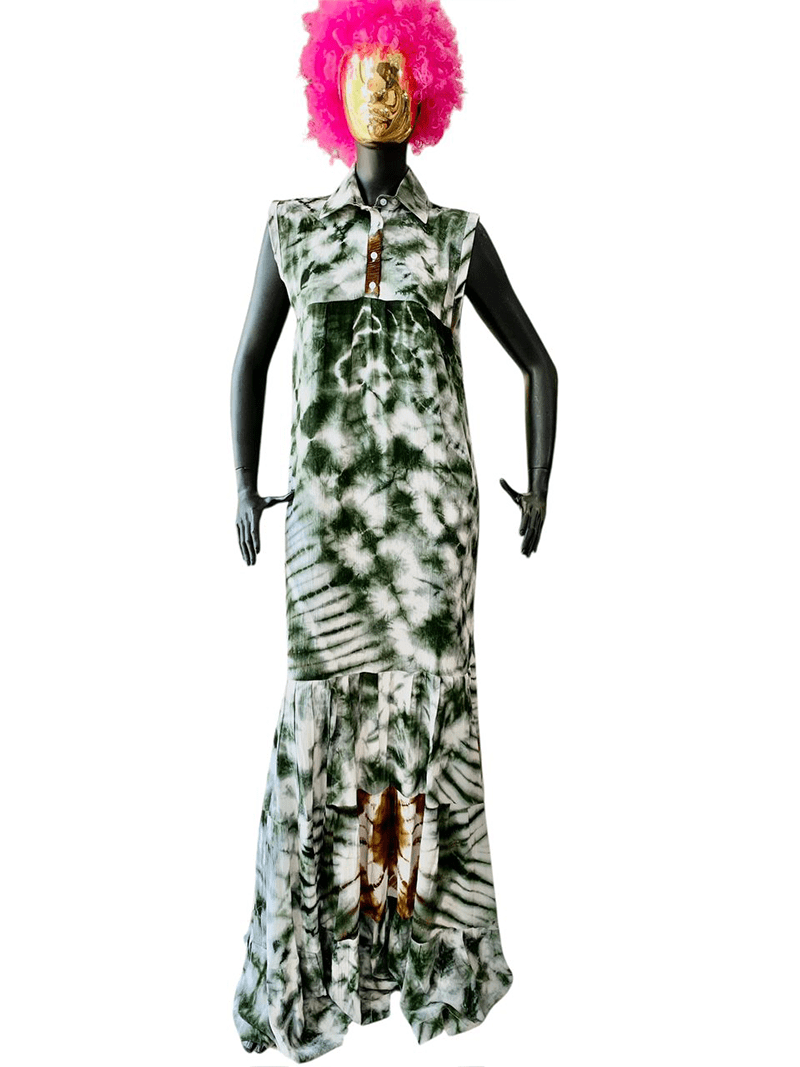 Robe longue sans manche tissu léger dampé vert blanc marron.