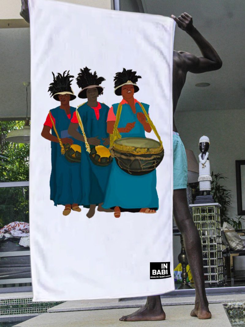 Cette serviette de bain, piscine et plage blanche est faite à 100% de coton, imprimé du modèle des musiciens. Ce sont des artistes chargés de jouer de la musique à l’aide d’instruments traditionnels tels que : la kora, le balafon ,le tam-tam etc…lors des cérémonies ou représentations culturelles.